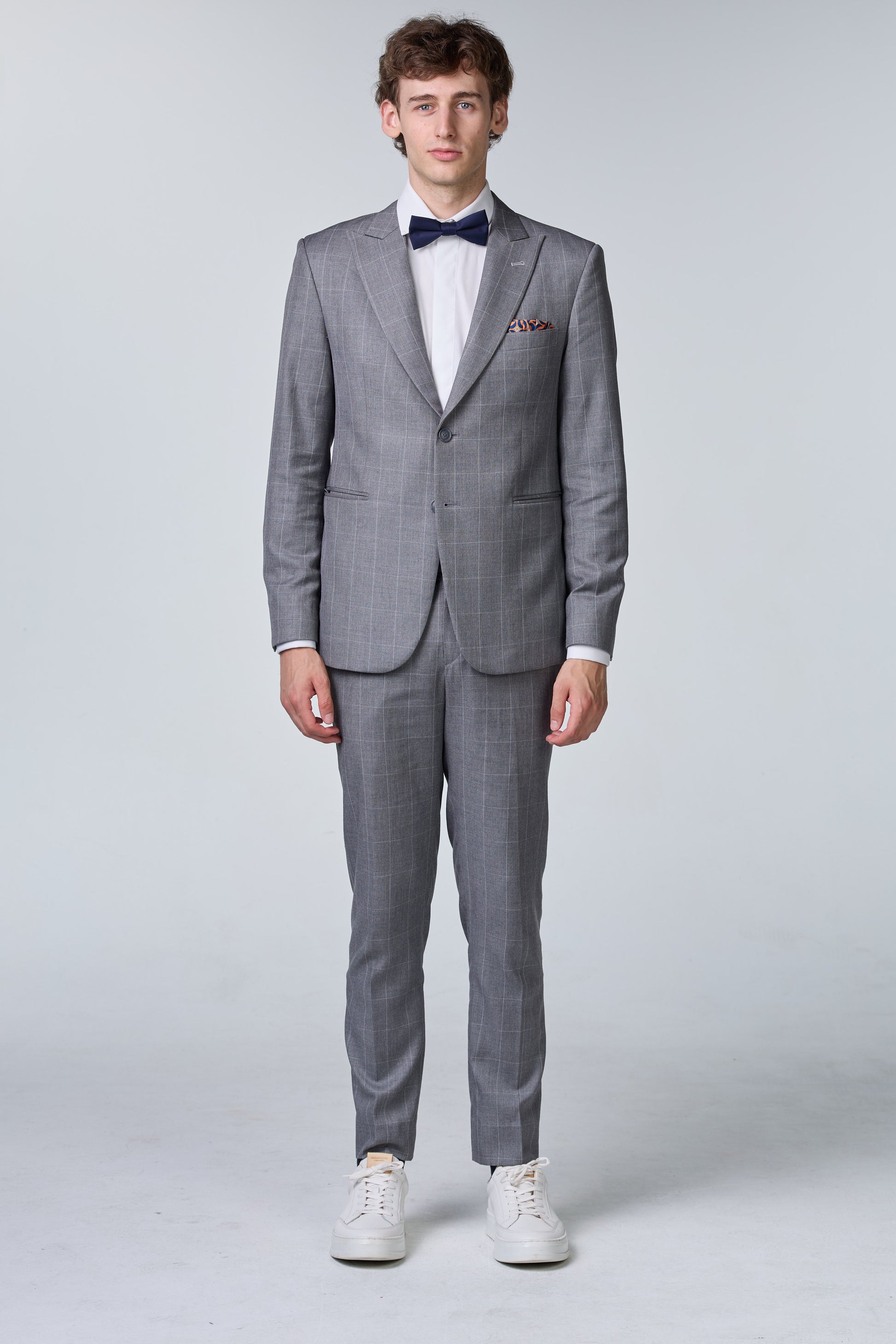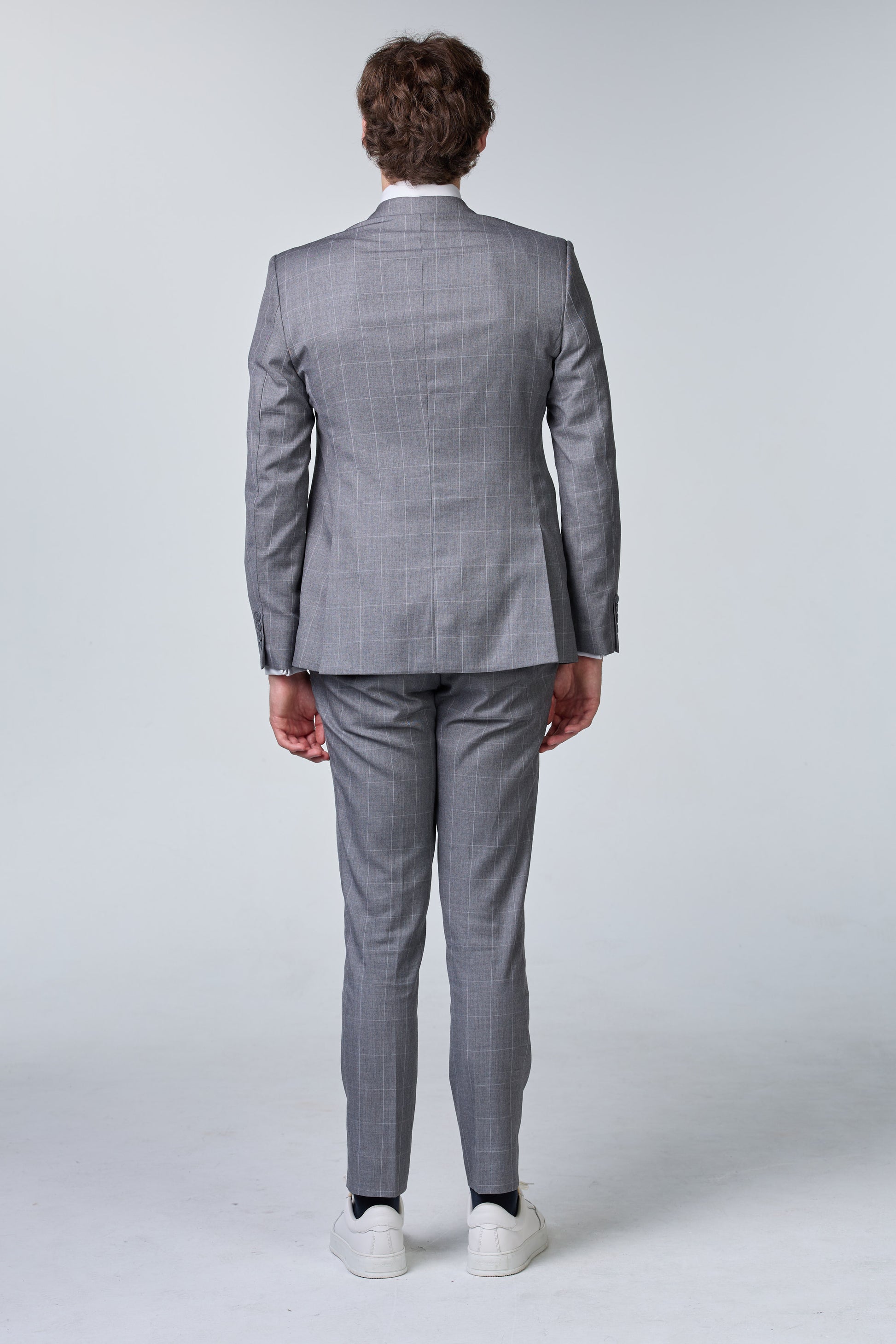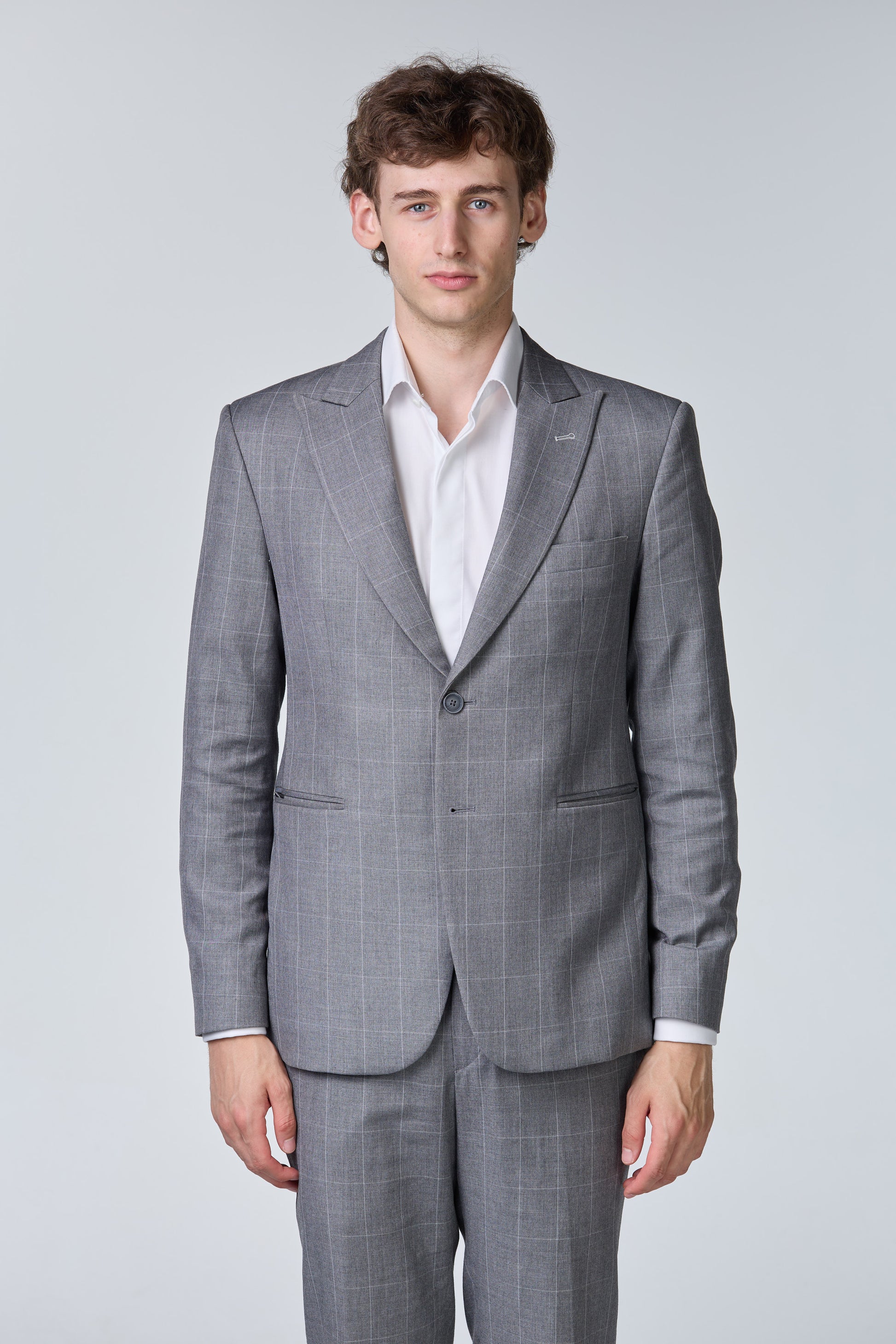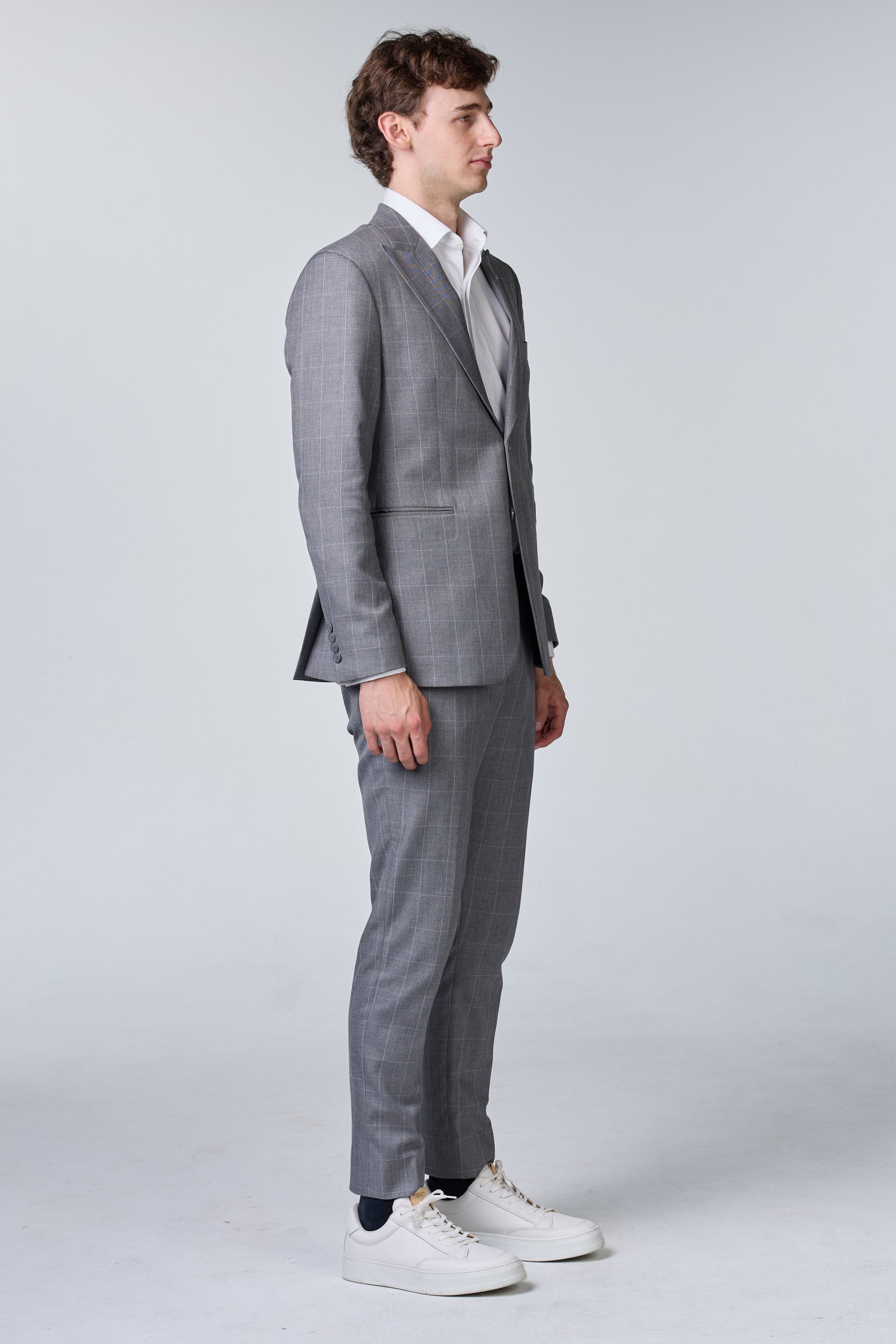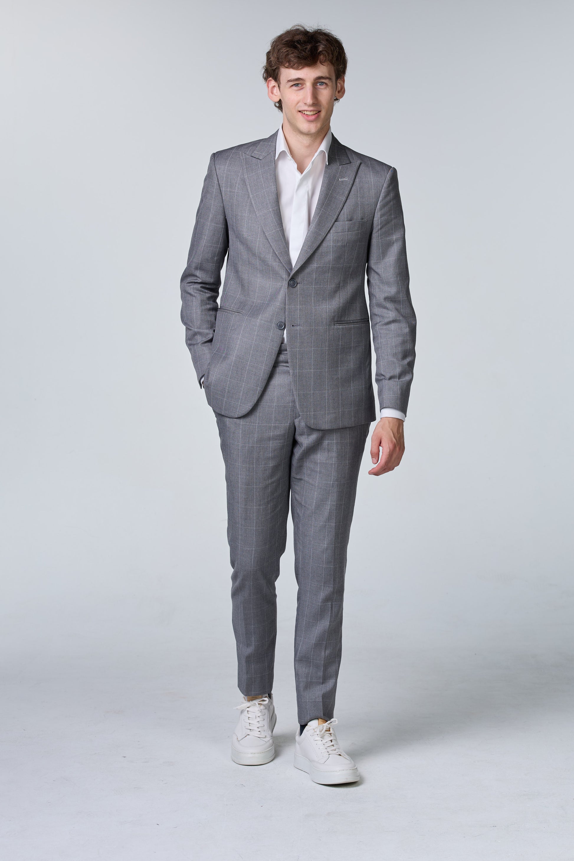 Grau karierter Anzug aus Finewool 130s Klassischer grauer Anzug aus Finewool 130s mit Karomuster für einen stilvollen, professionellen Auftritt.