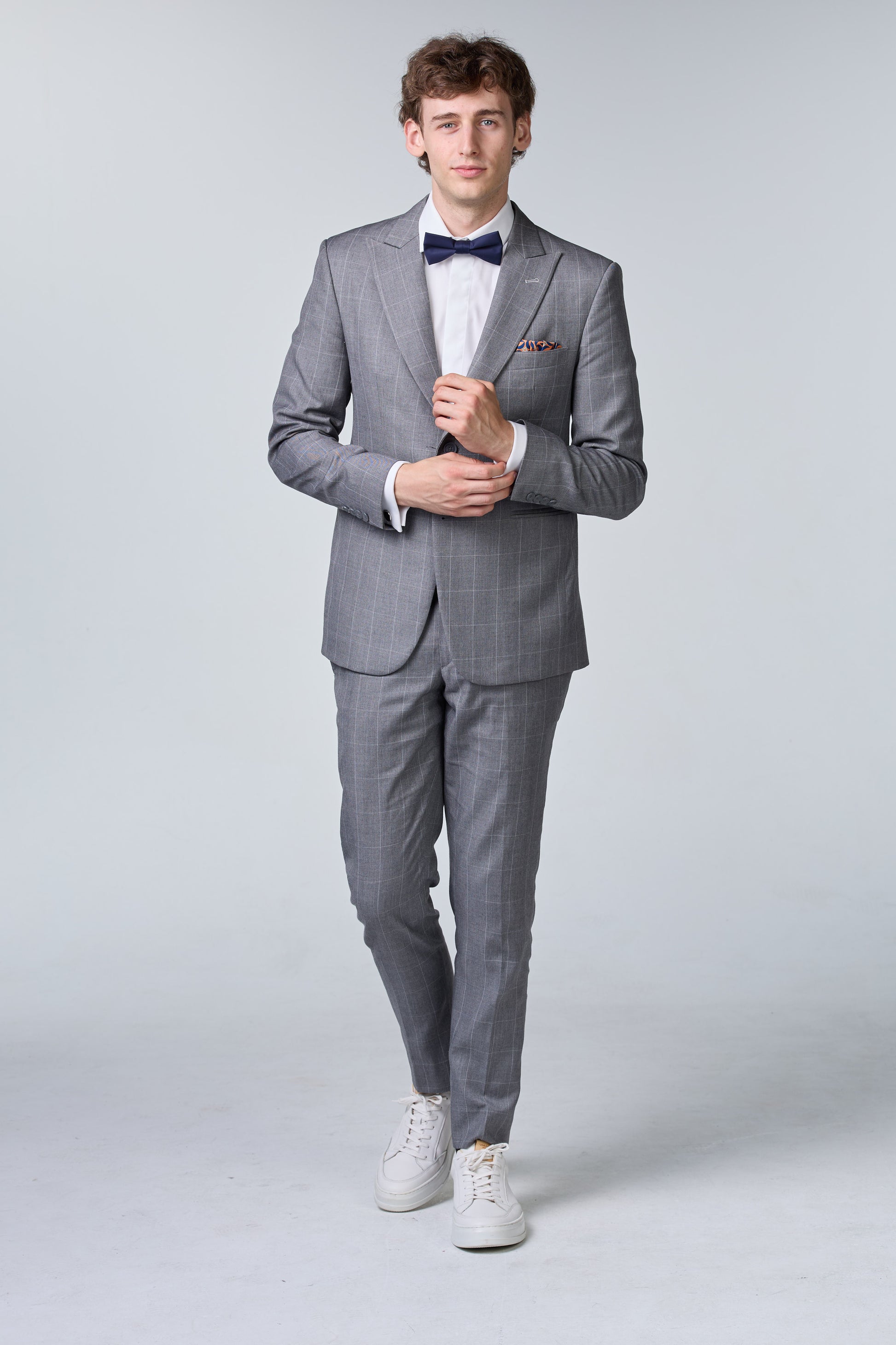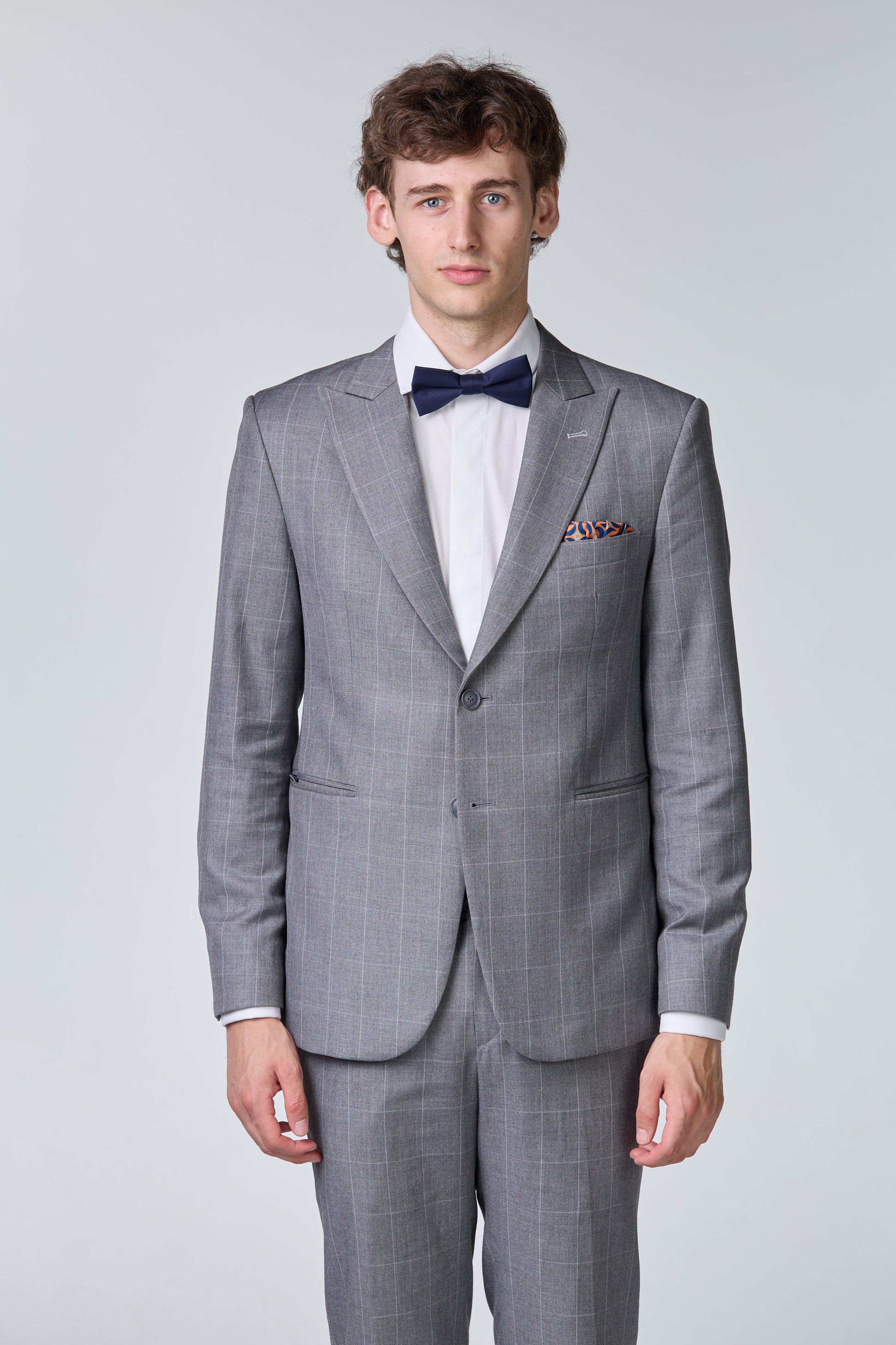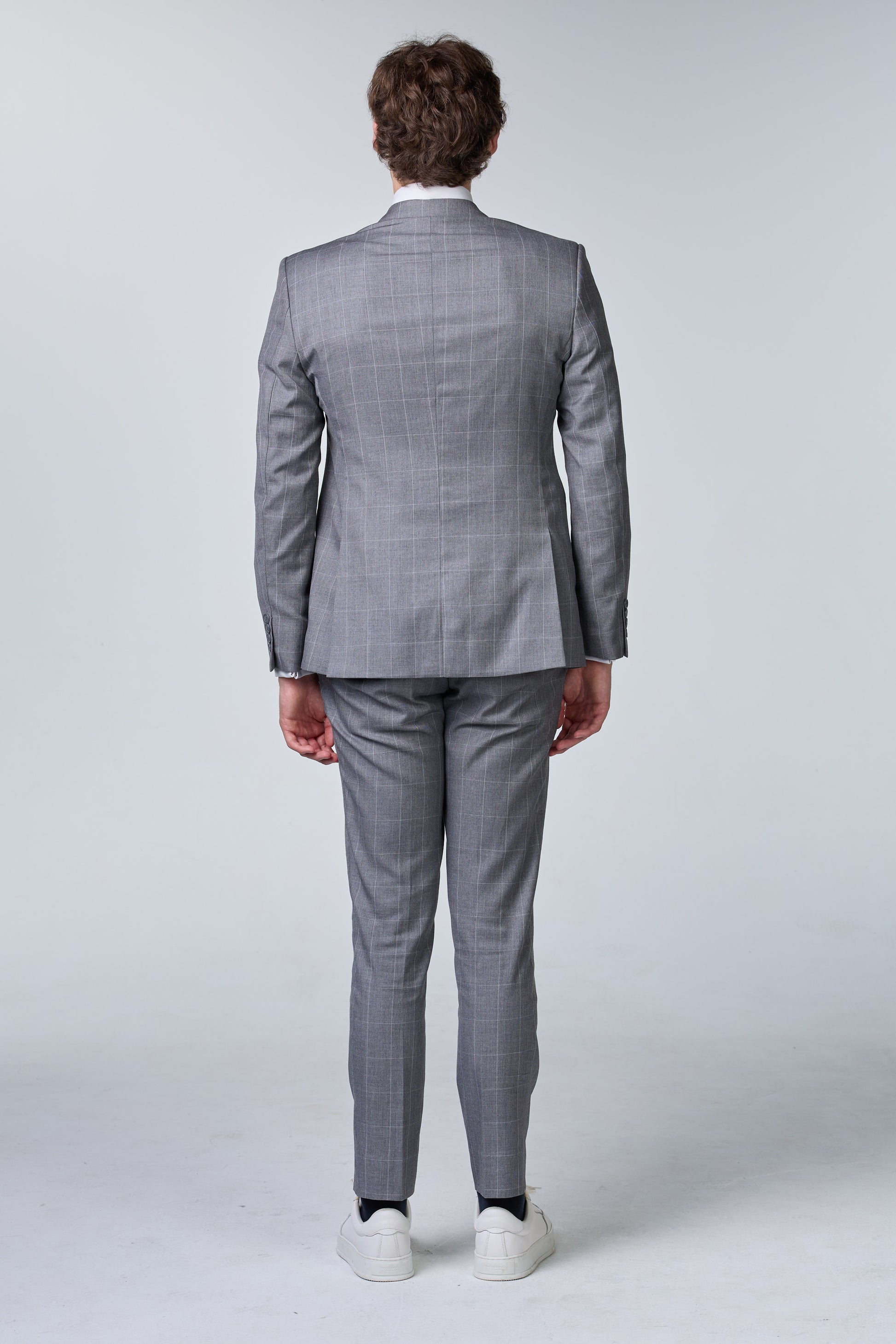 Grau karierter Anzug aus Finewool 130s Klassischer grauer Anzug aus Finewool 130s mit Karomuster für einen stilvollen, professionellen Auftritt.