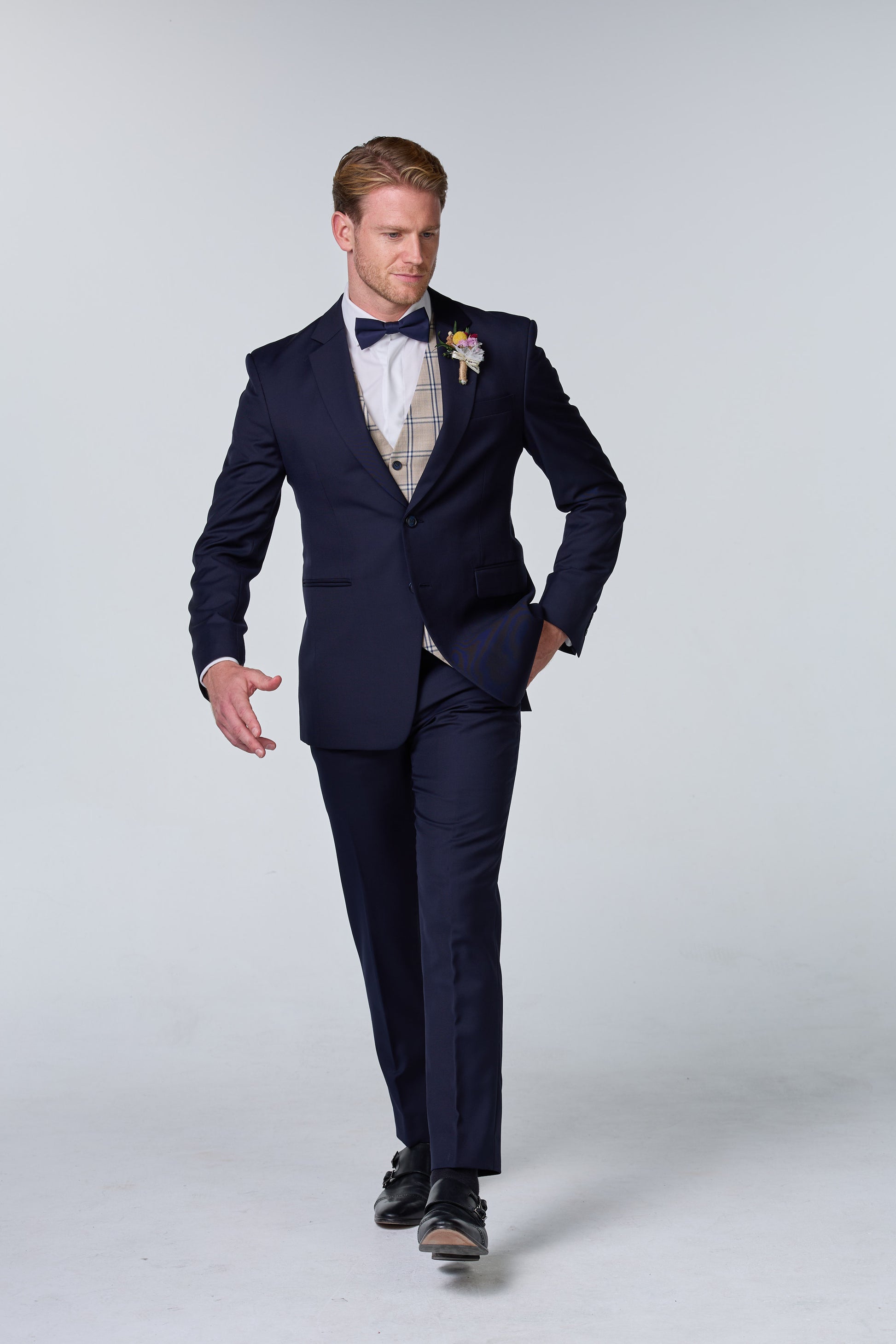 Dreiteiliger Hochzeitsanzug Blau mit Beige Weste Dreiteiliger Hochzeitsanzug in Blau mit einer kontrastierenden beigen Weste für einen eleganten Look.