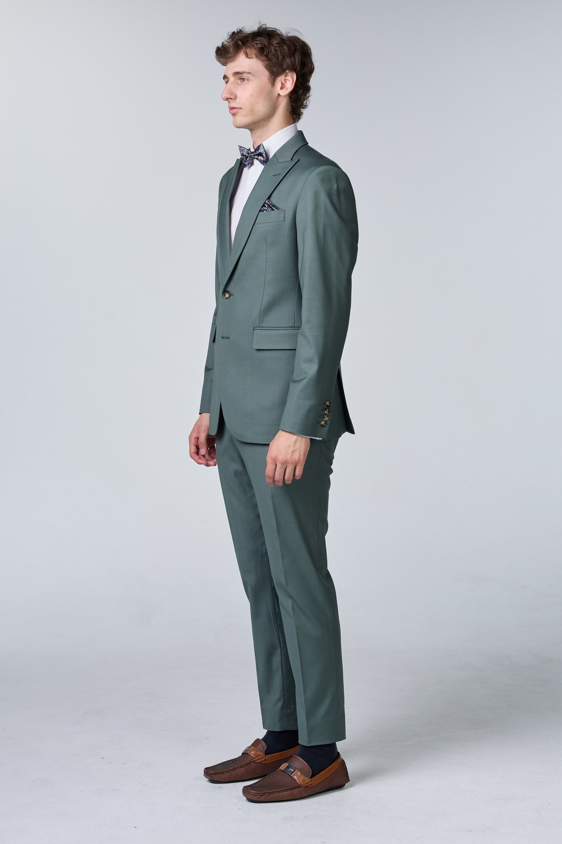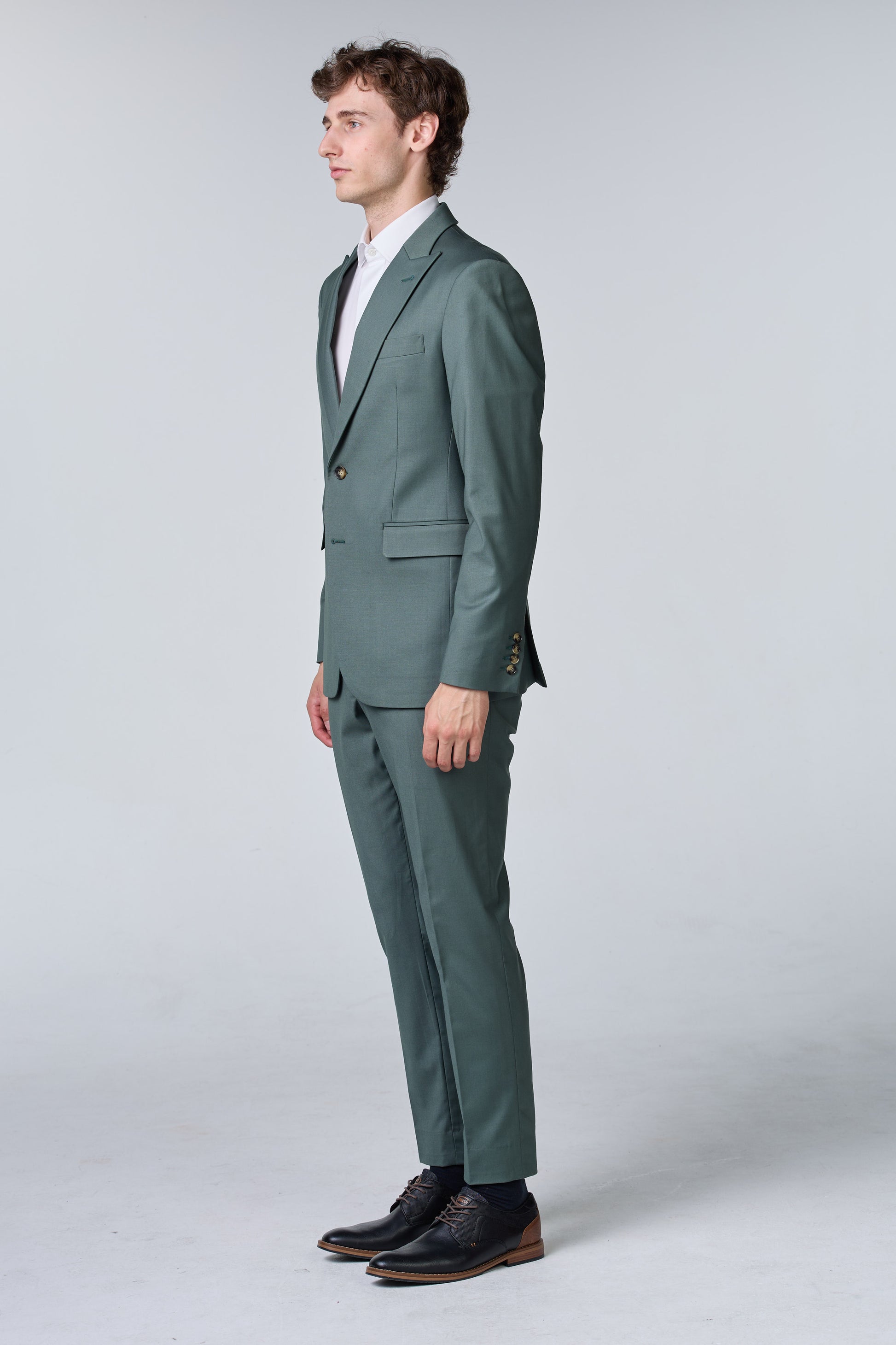 Moderner salbeigrüner Anzug aus Wolle mit 3% Elasthan für Flexibilität und hohen Tragekomfort.