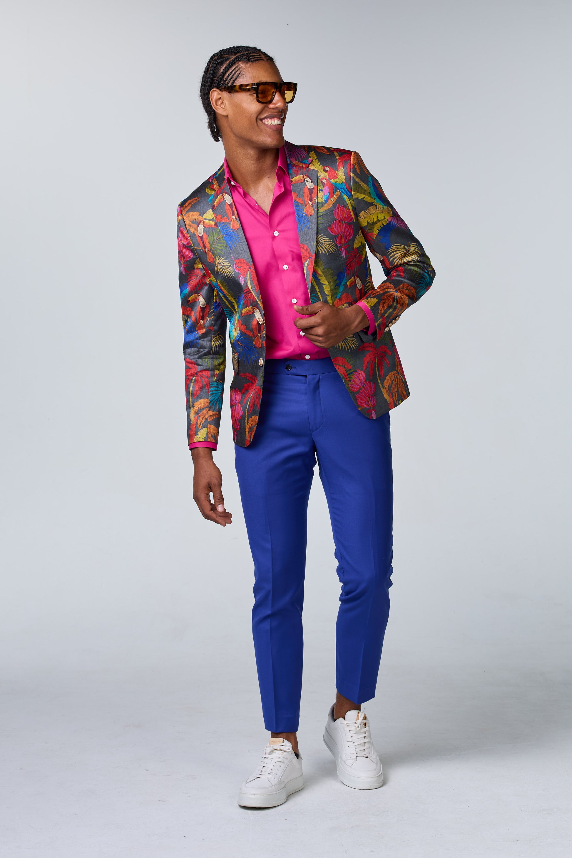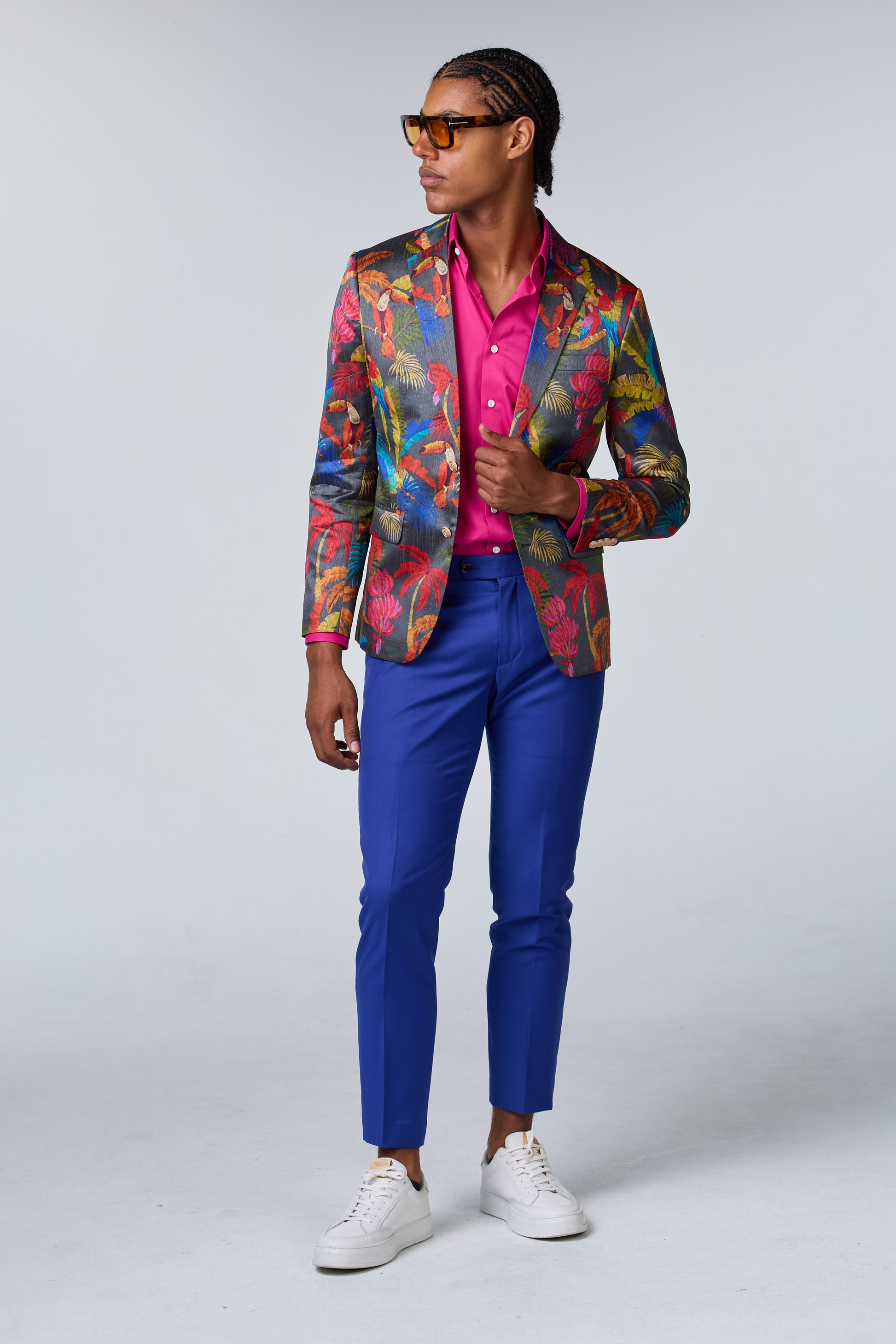 Seidensakko mit Muster und königsblauer Hose Ein Seidensakko mit einzigartigem Muster, kombiniert mit einer königsblauen Hose für einen extravaganten Stil.